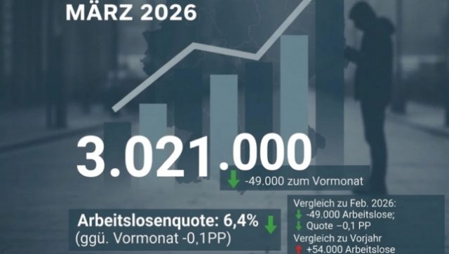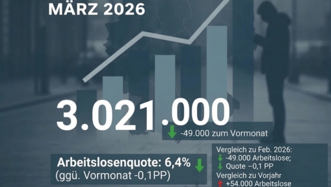 Im März 2026 ist die Arbeitslosenzahl in Deutschland um 49.000 auf 3,021 Millionen gesunken. Die Arbeitslosenquote verringerte sich damit um 0,1 Prozentpunkte auf 6,4 Prozent und blieb damit auf dem Niveau des Vorjahres. Trotz des saisonüblichen Frühjahrsanstiegs zeigt sich der Arbeitsmarkt in diesem Jahr vergleichsweise stabil, wie Andrea Nahles, Vorstandsvorsitzende der Bundesagentur für Arbeit (BA), bei der Pressekonferenz in Nürnberg betonte.